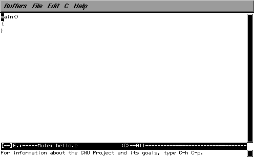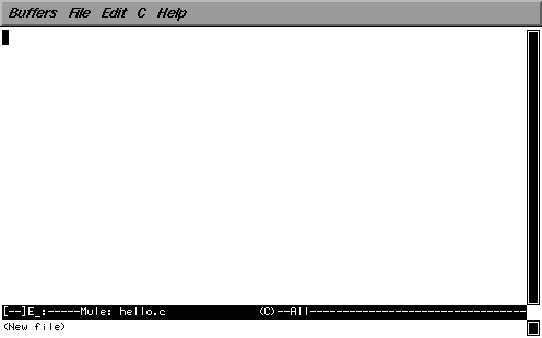 mule が起動し、mule のウィンドウが現われると思います。 おそらくまだ hello.c というファイルが存在しないので、 画面の最下行に (New File) と表示されているはずです。 これはそのファイルを新規に作成することを示します。