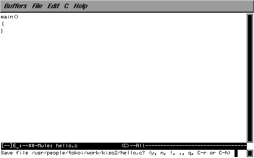 全部タイプできたら C-x C-c をタイプして mule を終了してください。 ファイルを保存するかどうか尋ねてくるので、y をタイプしてください。
