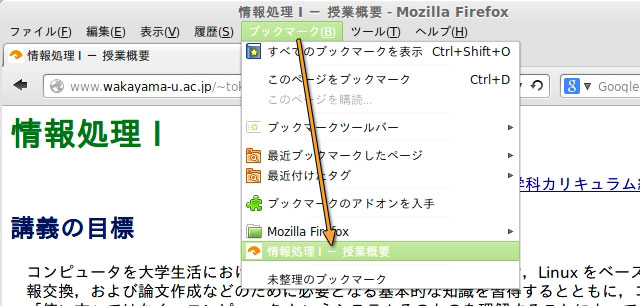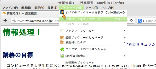 ブックマークは, よく参照するページを覚えておく機能です.現在,この講義の Web ページが表示されていると思いますから,これをブックマークに登録しておいてください.メニューの「ブックマーク」から「このページをブックマーク」を選ぶか,Ctrl-D をタイプしてください
