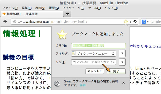 現在見ているページをブックマークに登録するかどうか確認するウィンドウが出ますので,フォルダに「ブックマークメニュー」が指定されていることを確認して,「完了」をクリックしてください.