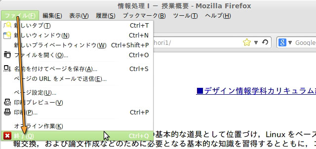 Firefox を終了するには,「ファイル」メニューから「終了」を選びます.タイトルバーの右上の「×」でも構いません.でも,講義はまだ続きますので,ここではまだ終了しないでください.