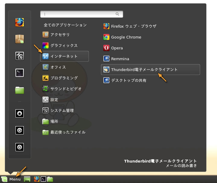この講義では,電子メールの読み書きするのに,Thunderbird というアプリケーションを使います.画面左下の「Menu」から「インターネット」→「Thunderbird 電子メールクライアント」の順に選んでください.Thunderbird が起動します.