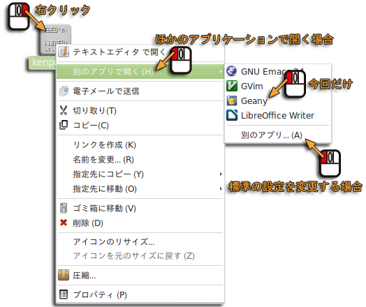 ファイル管理ソフトウェア Nautilus のウィンドウでファイルのアイコンをダブルクリックすれば,そのファイルに関連付けられたアプリケーションが起動します.例えば,"kenpou.txt" のようにファイル名の拡張子が ".txt" のファイルは,演習室のコンピュータでは標準で「テキストエディタ」に関連付けられいます.この関連付けは,次のようにして変更できます.