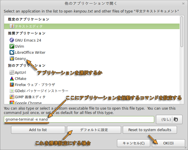 「ほかのアプリケーションで開く」のウィンドウで開くアプリケーションを選んだ後,「デフォルトに設定」をクリックしてから「閉じる」をクリックしてください.なお,「端末」の中で使用するアプリケーションを起動する場合は,このウィンドウの下の欄に「gnome-terminal -x (起動するアプリケーション)」とすれば,(起動するアプリケーション) に指定したコマンドを,ダブルクリックしたファイルのファイル名を引数として与えて起動します.