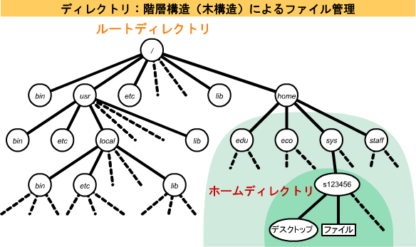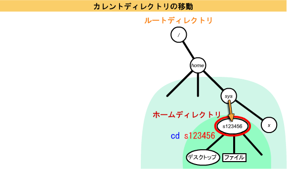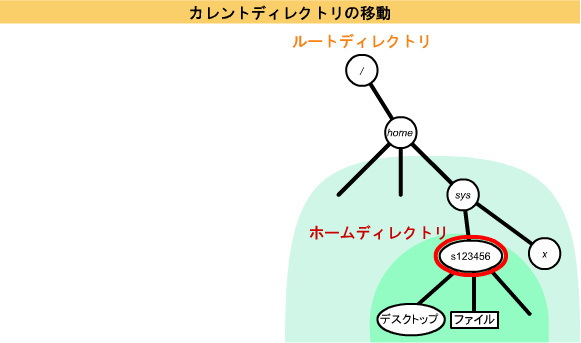 端末を開いた直後,その端末内で動作しているシェルのカレントディレクトリは,利用者のデータを保存する外部記憶装置の領域の起点になっています.この起点のことをホームディレクトリと呼びます.したがって,上記の "/home/sys/s123456" は,ホームディレクトリを表します.
