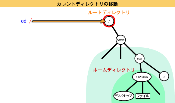 ディレクトリ木の階層は "/" で区切ります.あるファイルやディレクトリのある場所の表記をパス(経路)と呼びます.パスをルートディレクトリを起点にして表す場合を,絶対パス,カレントディレクトリを起点にして表す場合を相対パスと呼びます.上図の「デスクトップ」というディレクトリは,絶対パスだと "/home/sys/s123456/デスクトップ" と表されますが,"/home" というディレクトリからの相対パスで表せば "sys/s123456/デスクトップ" となります.