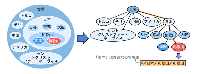 これは世界に例えるなら,世界を下図右のような木構造で表したものです.これは木がひっくり返った形をしており,一番根本がてっぺんにあります.この木構造では,「住所」は“/日本/和歌山/和歌山”のように表します.