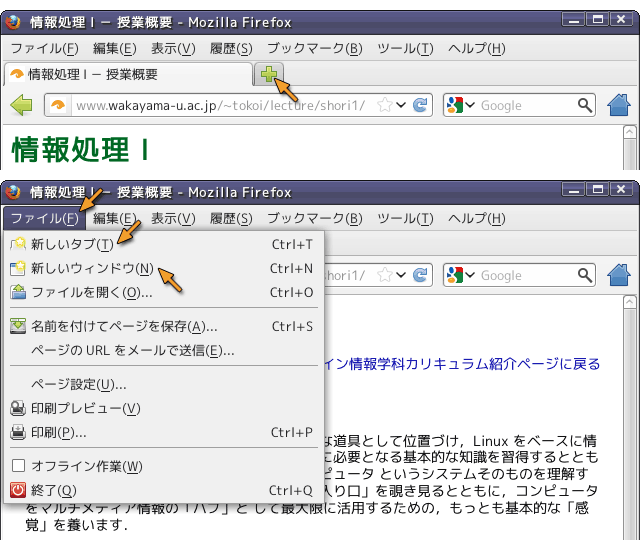 複数のタブ/ウィンドウを開くこの作業の前に,講義の Web ページと,これから開くファイルの両方を見ることができるよう,Web ブラウザのタブをひとつ新規作成しておきます.Firefox であれば,アドレスバーの上部のタブの右端にある「+」をクリックするか,「ファイル」メニューから「新しいタブ Ctrl-T」を選んでください.または,「新しいウィンドウ Ctrl-N」を選んで新しいウィンドウを開いてください(画面が広ければこちらのほうが便利かも).