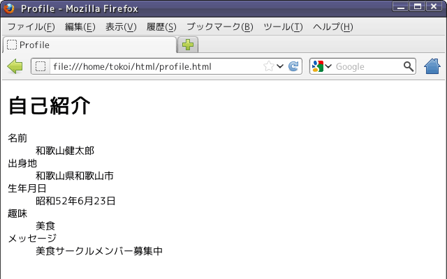 <!DOCTYPE html> <html lang="ja"> <head> <meta charset="utf-8"> <title>Profile</title> <style> dt { font-weight: bold; } </style> </head> <body> <h1>自己紹介</h1> <dl> <dt>名前</dt> <dd>和歌山健太郎</dd> <dt>出身地</dt> <dd>和歌山県和歌山市</dd> <dt>生年月日</dt> <dd>昭和52年6月23日</dd> <dt>趣味</dt> <dd>美食</dd> <dt>メッセージ</dt> <dd>美食サークルメンバー募集中</dd> </dl> </body> </html>