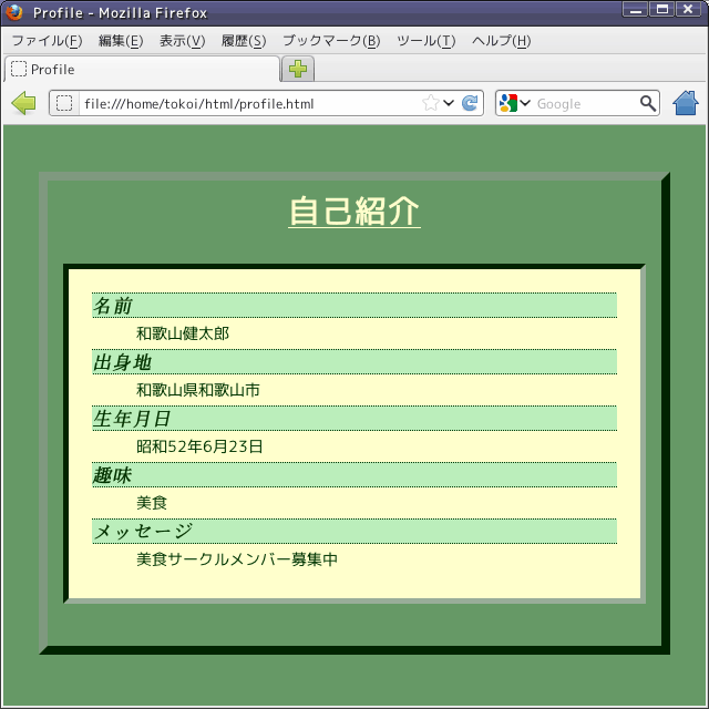 <!DOCTYPE html> <html lang="ja"> <head> <meta charset="utf-8"> <title>Profile</title> <style> body { border: outset 8px; line-height: 2; margin-top: 3em; margin-left: 5%; margin-right: 5%; height: 30em; color: #003300; background-color: #669966; } dl { border: inset 5px; padding: 1.5em; margin: 1em; background-color: #ffffcc; } dt { font: bold italic larger serif; border-top: dotted thin; border-bottom: dotted thin; background-color: #bbeebb; } h1 { text-align: center; text-decoration: underline; color: #ffffcc; } </style> </head> <body> (中略) </body> </html>