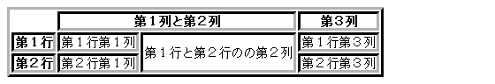 同様に2行以上にまたがったセルを作るには,そのセルに rowspan="数値" という属性を指定します.数値はまたがる行数です.「第2行第2列」のセルが削除されていることに注意してください.下線部を変更した後ファイルを保存し,Firefox で再読み込みしてください.