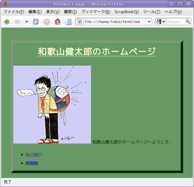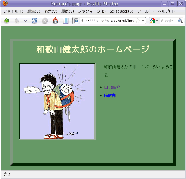 画像に枠や隣接する要素との間隔を設定することも可能です.profile.css あるいは style.css に下線部の内容を追加し,C-x C-s でファイルを保存してください.そして Firefox で再読み込みしてレイアウトを確認してください.