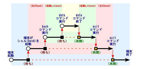 多分,何も起こらなかったように見えます.実際には,もとの bash とは別の bash が動いています.でも,コマンドとして起動した bash も bash に変わりありませんから,端末が起動する bash と同様,コマンドの入力を待ちます.