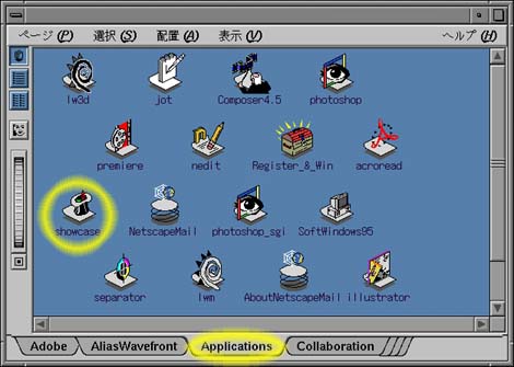 アイコンカタログのウィンドウの中の "Applications" のタブをクリックしてください。 その中のシルクハットが引っくり返ったようなアイコンが showcase です。 これをダブルクリックしてください。