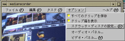もしどうしても動画像(ビデオ)の録画(キャプチャ)を行いたいときは、 以下のような手順で mediarecorder が使用するスクラッチファイルのディレクトリを /tmp に変更してください。 mediarecorder のメニューバーの“オプション”から、 “スクラッチディスクの設定”を選んでください。