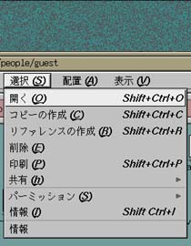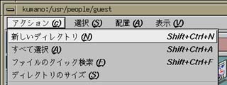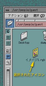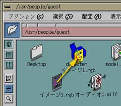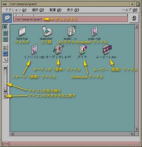 ディレクトリウィンドウの上部に表されている、 "/usr/people/ログイン名" (図のログイン名は guest)というのは、 "/" のサブディレクトリの "usr" のサブディレクトリの "people" のサブディレクトリの“ログイン名”という場所を示しています。 サブディレクトリの区切りにも "/" を使います。