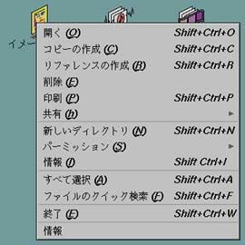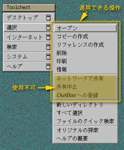 デスクトップ上のアイコンを選択すると、 Toolchest の“選択”メニューのいくつかの項目が、 そのファイルに適用できるようになります。 また、ディレクトリウィンドウ内のアイコンを選択すると、 そのウィンドウのメニューバーの“選択”メニューの中のいくつかの項目が、 そのファイルに適用できるようになります。 マウスの右ボタンをクリックしても、 同じようなメニューが現れます。