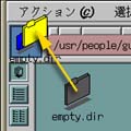 | ディレクトリウィンドウの中の "Desktop" というディレクトリは、 画面のデスクトップ(つまり背景の部分)に置いたものを格納しています。 このディレクトリにファイルをドラッグ&ドロップすると、 デスクトップ上にアイコンが現れます。 |