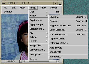 この場合は、メニューバーの "Image" メニューから "Adjust" → "Levels ..." を選んでください。