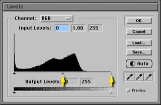 まず、このグラフの下の右端にある三角マークをドラッグしてみてください。 画像が明るくなったり暗くなったりすると思います。 それと同時に、グラフの上にある Input Levels という3つの欄の、 右端の欄の値が変化します。 これは元の画像の明るさの最大値です。 この明るさがグラフの下にある Output Levels の右側の欄の値になるよう、 画像全体の明るさを調整します。 右の画像は明るさの最大値を 192 にしたものです。 これを 255 にするので、全体の明るさは (明るさの最小値が 0 の場合)255÷192≒1.32 倍になります。
