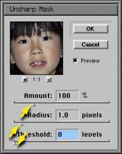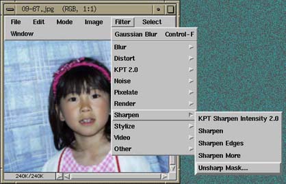そういう場合は輪郭の強調処理を行ってやります。 メニューバーの "Filter" メニューの "Sharpen" に、 いくつか輪郭の強調に関係するメニューがあります。 何も考えずに輪郭を強調すると、 輪郭だけでなく画像に含まれる雑音まで強調してしまい、 かえって画像を損なってしまう恐れがありますから、 ここでは "Unsharp Mask ..." を選んでください。 これは試行錯誤しながら輪郭を強調できます。