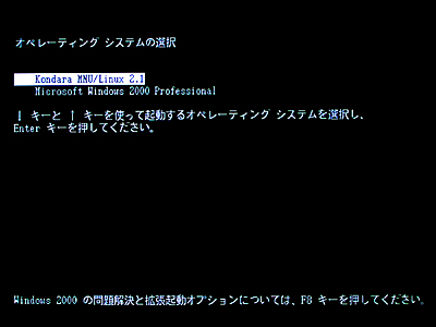 コンピュータの起動に成功すると、上のような画面が現れます。もし Windows 2000 Professional を起動してしまったときは、 Ctrl キーと Alt キーを同時に押しながら Delete キーをタイプ (Ctrl-Alt-Del) し、 Windows 2000 のログインパネルから再起動を選んでください。