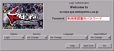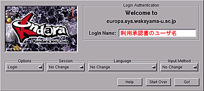 みなさんのシステム情報学センターの利用承認書に書かれているログイン名(ユーザ名)とパスワードをここにタイプします。 このログイン名とパスワードは、 「1.3 コンピュータ演習室について」に挙げたいずれの演習室でも共通に使用できます。