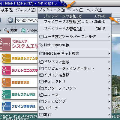 すでにいくつかのブックマークが登録されていますが、 日本からでは使いようのないものも結構あるので、 必要に応じて自分で整理してください。「ブックマークの管理 Ctrl+B」を選ぶか Ctrl-B をタイプすれば、 ブックマークの管理ウィンドウが現れます。