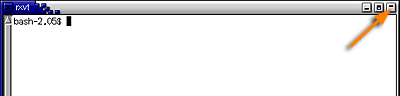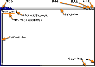 ターミナルは、rxvt というアプリケーションです。 この中でさらに「シェル」と呼ばれるプログラムが稼動しています。 ターミナルのウィンドウの周囲は、次のようになっています。