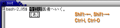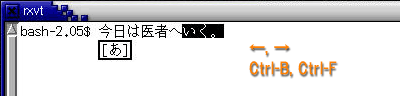 (6) 変換対象の文節を右に移動するにはCtrl-F をタイプするか、 →(右矢印)をタイプします。 左に移動するには Ctrl-B をタイプするか、 ←(左矢印)をタイプします。