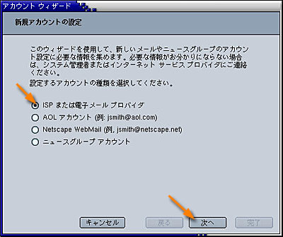 「新規アカウントの設定」では、「ISPまたは電子メールプロバイダ」を選択し、 「次へ」をクリックしてください。