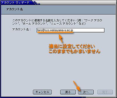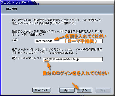 「個人情報」では「名前」の欄に自分の名前(ローマ字推奨)、 電子メールのアドレスは「自分のログイン名@sys.wakayama-u.ac.jp」にしてください。 ログイン名が s075000 なら、メールアドレスは次のようになります (メールアドレスは利用承認書にも記載されています)。