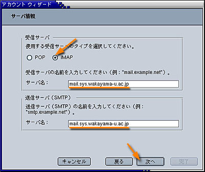 「サーバ情報」では、使用する受信サーバのタイプとして IMAP を選択してください。また、受信サーバ、送信サーバとも、以下の内容を設定してください。