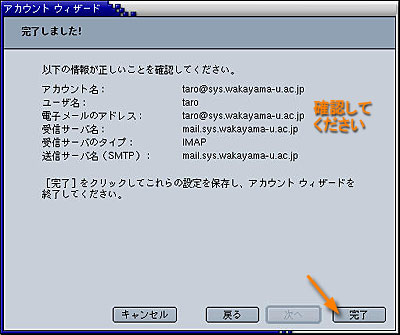 これでメールの設定が完了しました。設定が正しいかどうか確認してください。 間違っていれば「戻る」のボタンを押して、訂正してください。