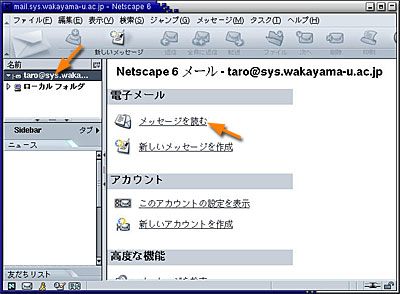 Netscape の Mail が起動します。「名前」の欄にあるアカウント名をクリックすれば、 そのアカウントの操作画面が現れます。自分宛てのメールを読むには、 「メッセージを読む」をクリックしてください。そうするとパスワードを聞いてきます。