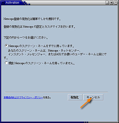 すると、Netscape が起動します(ちょっと時間がかかります)。最初に Netscape を起動すると、有効化 (Activation) のウィンドウが現れます (次回以降このウィンドウは現れません)。