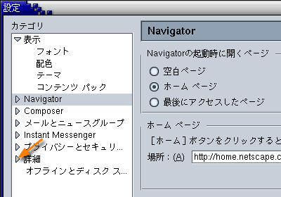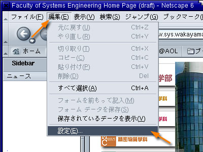 Netscape を使うにあたり、 いくつか初期設定を行っておく必要があります。 まず最初に、メニューバーの "編集" メニューから、 "設定" を選んでください。