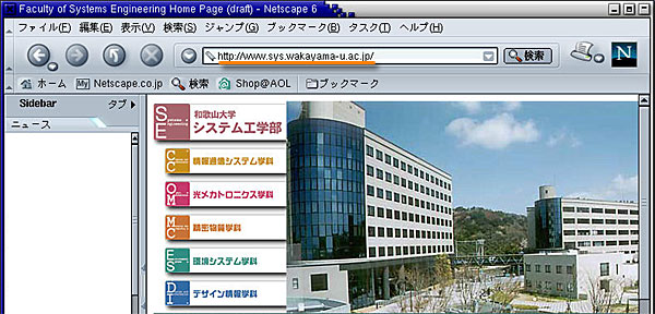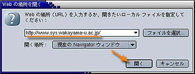 ここに上の URL をタイプし、 その後「開く」のボタンをクリックしてください。 システム工学部のホームページが表示されると思います。 Netscape 本体のウィンドウ上部にある欄に書かれている内容を直接書き換えた後 Enter をタイプしてページを開くこともできます。