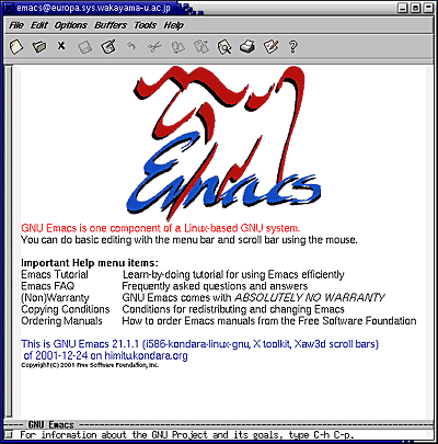 emacs は、 この中のエディタで最も高機能なエディタです。このエディタの特徴は自己拡張可能な点にあり、ほとんどの機能が emacs 自体がもつ emacs lisp というプログラミング言語で実現されています。 また英語、日本語のみならず中国語(大陸、台湾)、韓国語、タイ語など、 多国語に対応しています。xemacs はこの emacs に対して X Window System 関係の機能を拡張したものです。