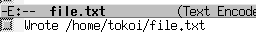 ここに file2.txt とタイプして、[Enter] をタイプしてください。file2.txt というファイルが作成されます。C-x C-s が現在のファイル名でファイルを保存するのに対し、C-x C-w は別のファイル名でファイルを保存します。