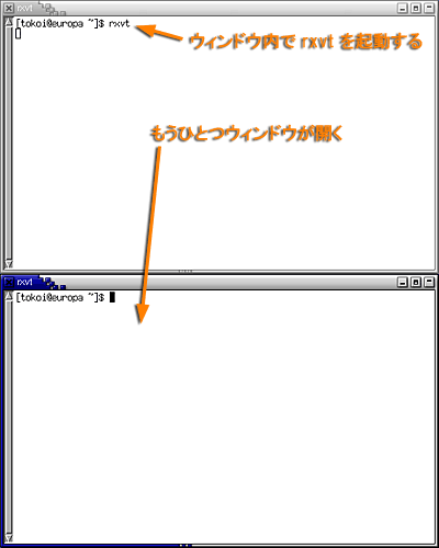 たとえば、ターミナルのシェルからコマンド (rxvt) でターミナルのウィンドウを開いたりすることができます。