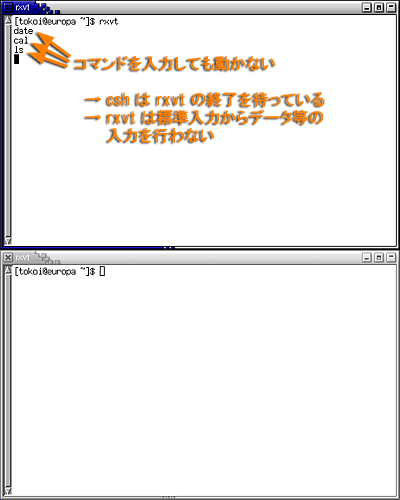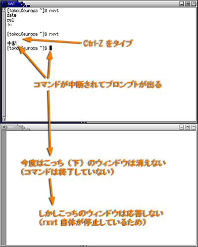 もう一度 rxvt を起動してターミナルのウィンドウを開き、今度は Ctrl-Z をタイプします。今度はもう一方のウィンドウは消えません。しかし、もう一方のウィンドウは全く応答してくれません。