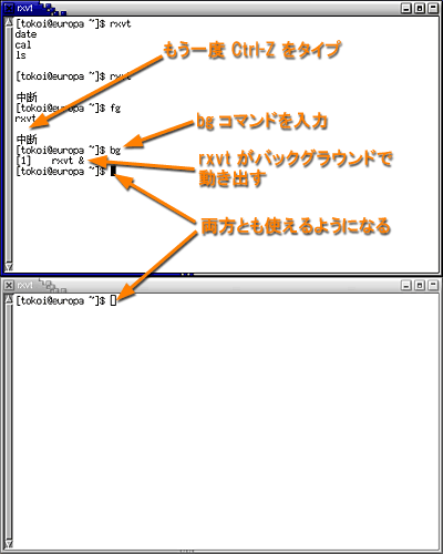 もとのウィンドウでもう一度 Ctrl-Z をタイプします。そして、今度は bg コマンドを実行します。こうすると、コマンドで起動した rxvt がもとのシェルと並行して(同時に)動くため、両方のウィンドウが使えるようになります。このようにコマンドが起動したシェルと並行して動いている状態をバックグラウンドで走っているといいます。