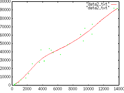 gnuplot> plot "data2.txt" smooth sbezier, "data2.txt" smooth unique[Enter] |