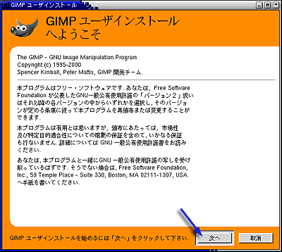このソフトウェアは GPL (GNU General Public License: GNU 一般使用許諾) のもとに配布されているソフトウェアです。そのまま「次へ」をクリックしてください。