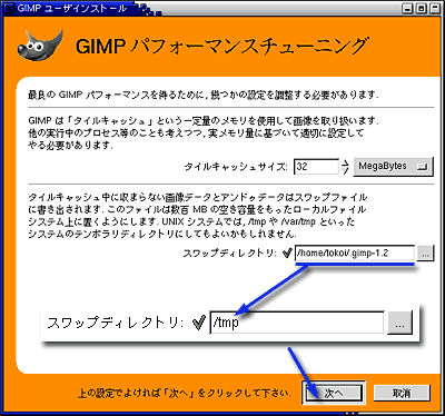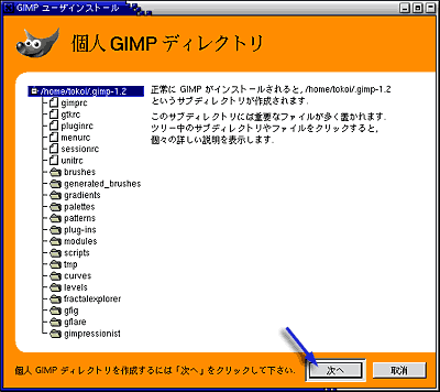 gimp はここでホームディレクトリに .gimp-1.2 というディレクトリを作り、そこに設定ファイルなど各種のファイルを置きます。そのまま「次へ」をクリックしてください。