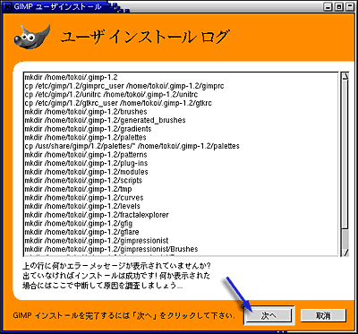 .gimp-1.2 というディレクトリの作成作業のログを表示します。エラーがなければ「次へ」をクリックしてください。