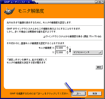 モニタの解像度は、「測定」ボタンを押して調整しても構わないのですが、今は時間がないのでそのまま「次へ」をクリックしてください。これで gimp の初期設定が完了しました。