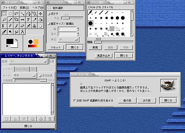 最初に gimp を起動したときには、初期設定のウィンドウが現れます。