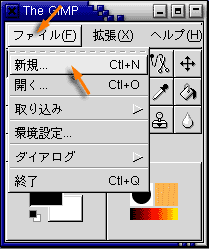 それでは、とにかく何か描いてみましょう。まず、「白紙」の画像を用意します。"The GIMP" ウィンドウの「ファイル」メニューから「新規」を選ぶか、Ctrl-N をタイプしてください。